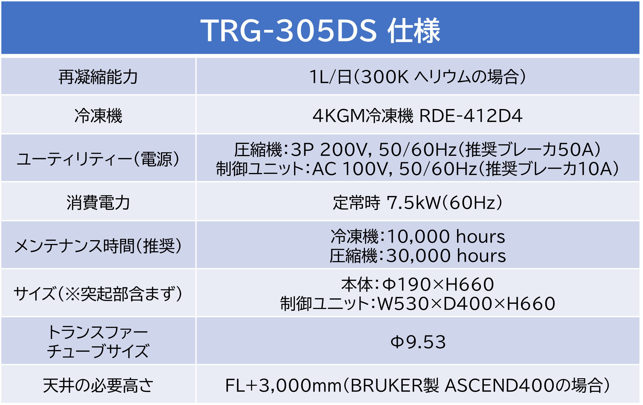 次に2つ目の「高効率な再凝縮能力」です。ラボレベルのNMR装置は400MHz~600MHzクラスの装置が多く使用されております。これらの装置は1日当たり約0.1~0.3リットルの液体ヘリウムが気化しますが、TRG-305DSは1日当たり約1リットルのヘリウムを再凝縮する能力を有しております。NMR装置は運転を停止しないことが重要なため、液体ヘリウムの供給不安はなんとしても避けたい事象です。長期的には供給についての危惧を拭い難いヘリウムにおいて、再凝縮装置は継続的な運転を担保する保険のような存在でもあります。また超電導マグネット等の汎用再凝縮装置として、当社では日量1ℓ~18ℓクラスの各種装置を取り揃えているほか、プラントレベルのヘリウム回収精製液化装置も取り扱っています。