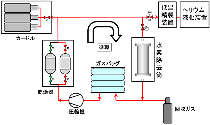 - 連続して水素ガスを除去することができます。これにより、循環回収系内におけるヘリウムガス中の水素ガス成分の濃縮を防止し、液化装置の安定した運転が可能となります。