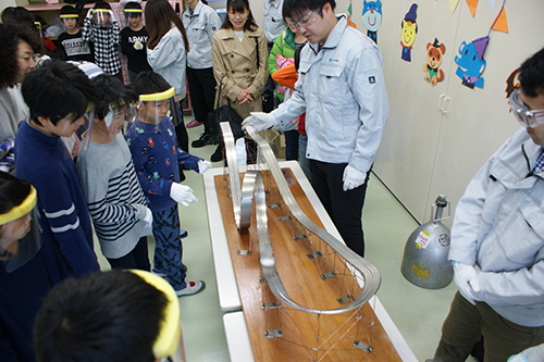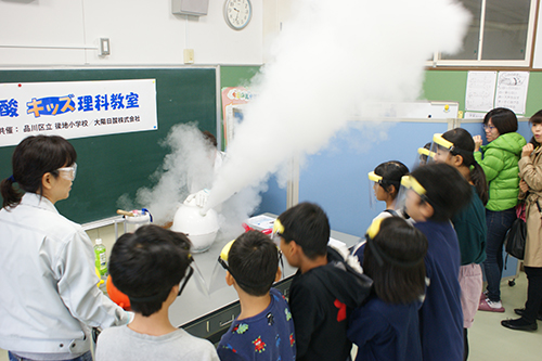 当社では、液体窒素を利用した実験を通じて、子どもたちに「科学を身近に感じてもらうこと」を目的に「大陽日酸キッズ理科教室」を開催しています。この教室は、子どもたち一人ひとりが液体窒素でバラの花を凍らせるなど、実際に体験してもらうのが特徴です。