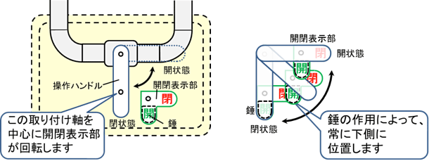 また、弁が開状態のときには「開」が、閉状態のときには「閉」がそれぞれ見えるような構造の表示部を操作ハンドルに取り付けたため、弁の開閉状態を容易に確認でき、操作ハンドルの誤操作を防止することができます。