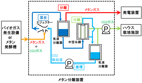 - この装置を利用したシステムにより、バイオガス中のメタンを発電などに利用でき、またバイオガス中のCO2を植物育成などに利用できます。