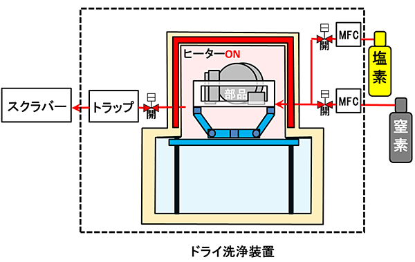 - 低濃度の塩素ガスで洗浄できるので、石英ガラス製の部品の腐食を抑えることができます。