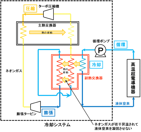 本特許の冷却装置および冷却方法は、副熱交換器において液体窒素と熱交換して昇温したネオンガスを副熱交換器の低温側に戻し、過冷状態のネオンガスを昇温することで、液体窒素の凝固を防止できます。これにより、高温超電導機器を長期間連続して冷却することができます。