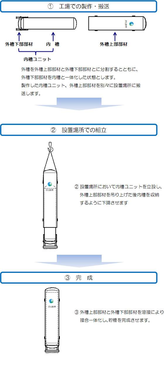 低温液化ガス貯槽は、断熱性を確保するために低温液化ガスを貯留する内槽とそれを囲む外槽との二重構造を持ち、工場内で製作した完成品が輸送され、現地で設置されます。近年貯槽の大型化のニーズが高まっていますが、公道での重量制限のためその大型化には限界がありました。一方、現地で貯槽を製作した場合には長い工事期間が必要でした。