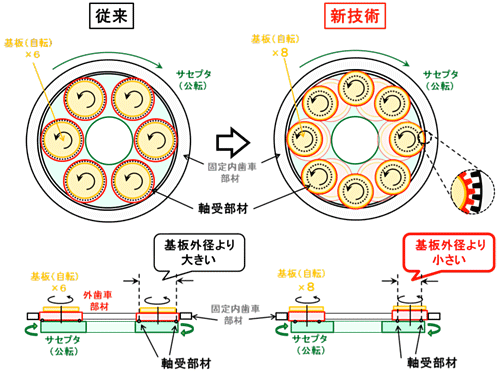 - 基板を自転させる軸受部材を基板外径より内側に配置することで、公転サセプタに配置可能な基板数を増加させることができます。